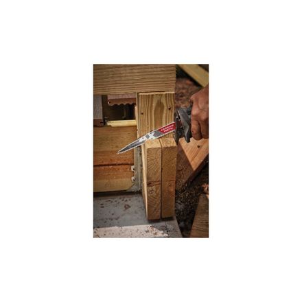 Scie alternative Milwaukee lame, dos conique, longueur 6 po, épaisseur 0,05 po, 5 tpi, dents ax sawzall, dent 1/2 po, denture universelle/dentée, tranchant en carbure, corps en carbure, rouge, matériaux applicables : bois noyé, bois, clou, vis, bardeau, plâtre, durock, synthétique, contreplaqué, matériaux composites et résidentiels