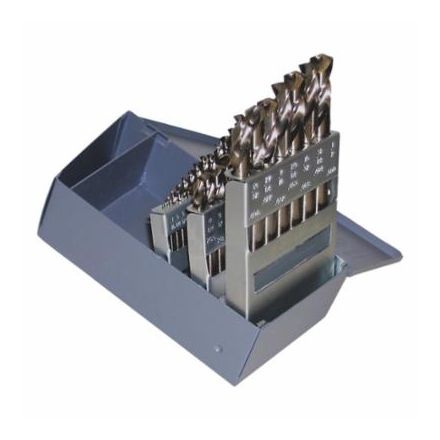 Chicago-Latrobe Machine à vis longueur jeu de forets, à toute épreuve, gamme : 559, système de mesure impérial, 1/16 po taille minimale foret foret, 1/2 po taille maximale foret foret, 135 deg foret angle de pointe, 29 pièces, spécifications : coupe à droite, goujure hélicoïdale, pointe fendue, queue droite, m42 hss-co 8, or/paille