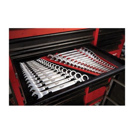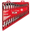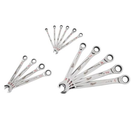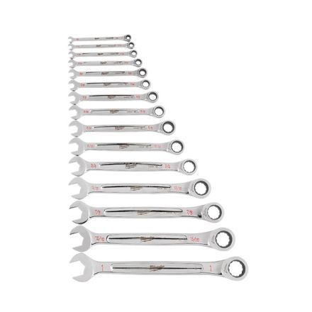 Milwaukee Jeu de clés mixtes à cliquet max bite, système de mesure SAE, 15 pièces, spécifications : Balançoire de 2,5 deg ARC, acier, chrome poli, dimensions 15 po l x 15 po l x 1-1/2 po h