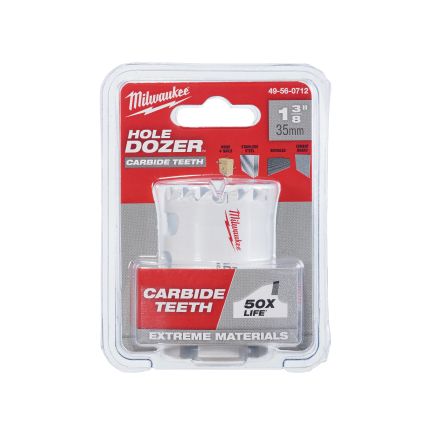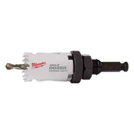 Milwaukee hole dozer scie cloche, 1-3/8 po diam., profondeur de coupe de 1,62 po, 4 tpi, 7/16 po arbre, 2,13 po de longueur hors tout, tranchant en carbure, tige hexagonale, 3/8 po, 7/16 po queue, utiliser arbre : 49-56-7010, 49-56-7250, matériaux applicables : acier inoxydable, matériau abrasif et bois de fixation incorporé