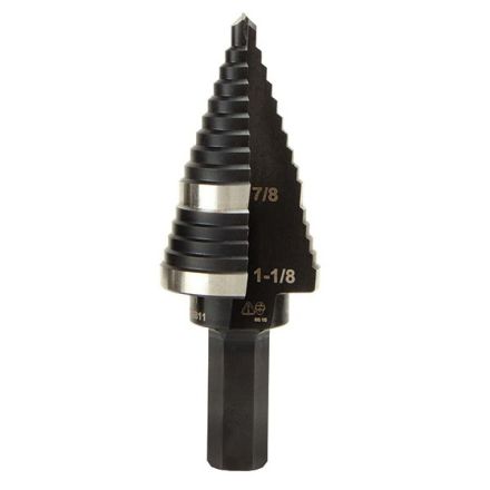 Klein foret étagé, impérial, #11, 7/8 po dia de trou minimum, 1-1/8 po maximum dia de trou, 3.15 po longueur totale, 2 étapes, 2 tailles de trous, 2 goujures, 3/8 po queue, tige hexagonale, tranchant en acier rapide, acier rapide