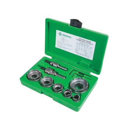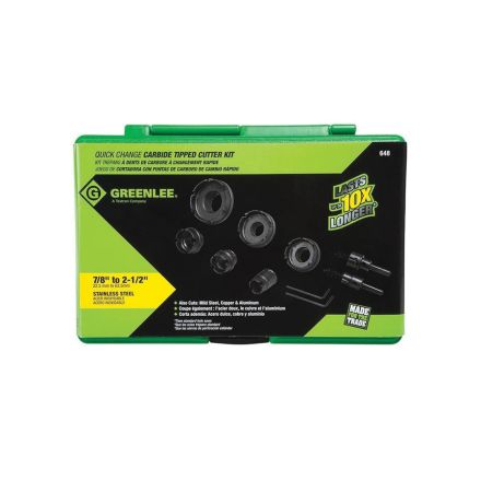 Kit de perçage greenlee, changement rapide, diamètre minimum de fraise 7/8 po, 2-1/2 po diamètre de fraise maximum, 8 pièces, spécifications : pointe en carbure, à utiliser avec : conduit 1/2 à 2 po, carbure de tungstène, revêtu doxyde