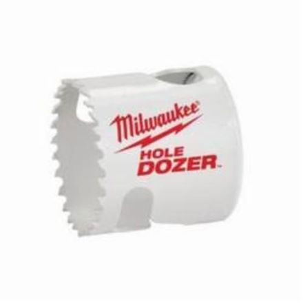Milwaukee scie cloche, gamme : hole dozer 49-56, 2-1/8 po diam., profondeur de coupe 1-5/8 po, 4/5 tpi, 1/4 po diam. X 3-1/2 po perceuse en équerre, tranchant bi-métal/8 % cobalt, corps en acier au carbone, tranchant denté, 240/105/160/80 tr/min, mandrin 1/2 po, tige hexagonale, 7/16 po queue, utilisez arbre : 49-56-7210, 49-56-7240, 49-56-7250 et 49-56-9100 à changement rapide arbre, blanc, matériaux applicables : aluminium, fonte, acier doux, tôle métal et acier inoxydable