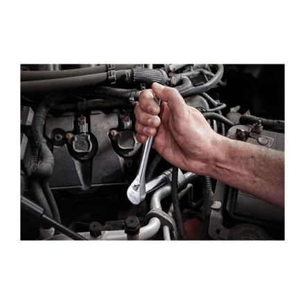 Milwaukee prise clé à cliquet, profil slim manuel, système de mesure : métrique/impérial, 3/8 po prise, 8-1/2 po de longueur hors tout, forme de tête carrée, 4 deg minimum doscillation ARC, 90 dents dengrenage, pas de desserrage rapide tête, acier, chrome poli