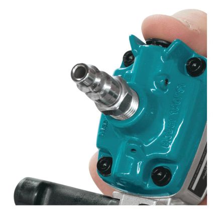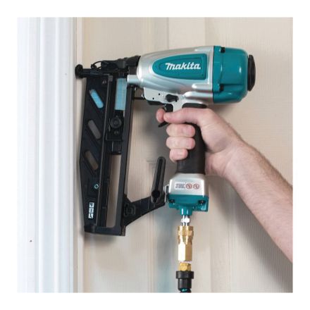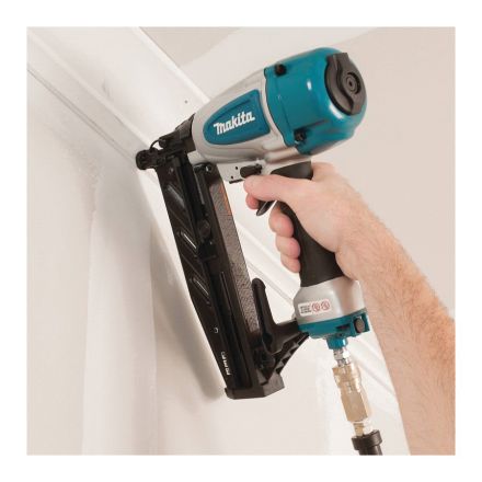 Makita droit cloueur de finition, outil nu, Fixation 1 à 2-1/2 po, Magazine de 100 ongles, Air de 70 à 120 psig, poignée côtelée antidérapante en caoutchouc souple, Niveau sonore 84 dba, Épaisseur maximale du matériau 16 ga, 12 po lx 3-3/4 po wx 11-3/4 po h dimensions