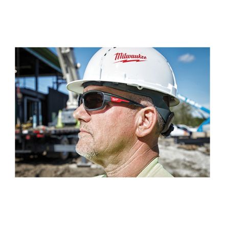 Milwaukee Verre de sécurité , haute performance, taille universelle, revêtement de lentille anti-buée/anti-rayures/résistant aux chocs, lentille transparente, monture entièrement encadrée/enveloppante, monture noire, monture en plastique, lentille en polycarbonate, oui uv protection, droit tempe, cahier des charges respecté : ansi z87.1+