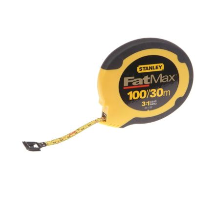 Stanley® FATMAX® Measuring Tape, Long, Measuring System: Imperial, 100 ft Blade Length, 3/8 in Blade Width, Polymer Coated Steel Blade, 16 in Stud Markings, Manual Rewind, Folding/Tru-Zero® Hook, Closed Case, ABS with Rubber Grip Case, Black/Yellow Case