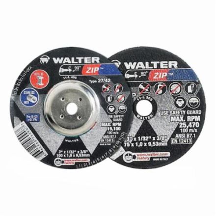 Walter Surface Technologies meule à découper zip, type 1, 4 po diam., épaisseur 1/8 po, 3/8 po, grain a24zip, gros grain, abrasif à loxyde daluminium, 15300 tr/min maximum, matériaux applicables : fonte, acier inoxydable, tôle et acier