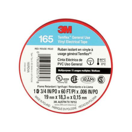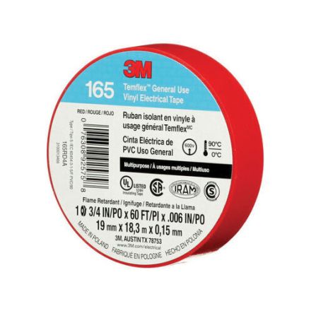 3M , 7100169492, ruban adhésif, multi-usage, gamme : 165, 60 pi de longueur, 3/4 po de largeur, 6 mil dépaisseur, vinyle, rouge, adhésif en caoutchouc, support en PVC, force dadhérence de 18 po-oz, 600/1 000 V, rigidité diélectrique de 1 000 v/mil, traction de 13 po-lb résistance, 194 deg f fonctionnement maximum, 32 deg f fonctionnement minimum, spécifications respectées : csa c22.2 non. 197 lime non. 048769 classe 9052-02/oanz lime no. e129200/certifié vde/ul 510