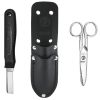- Electrician's scissors with stripping notches is also included and is crafted of strong, tough tempered steel and nickel plated finished to resist corrosion