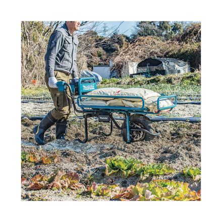 Makita brouette, assistée électrique, 287 livres, plateau en acier, 61-1/2 po lx 41-3/4 po wx 35-1/2 po d dimensions du bac, prise souple, poignée en caoutchouc, 3 roues, roue arrière, Essieu 7 po diam.