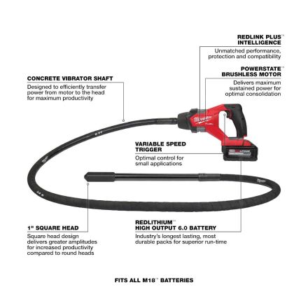- Generates up to three times more power than comparable cordless pencil concrete vibrators