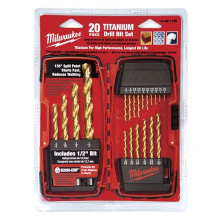 Milwaukee jeu de forets, gamme : thunderbolt secure-grip, 20 pièces, 3 plats queue, 135 deg point fendu, hss, revêtement titane, or