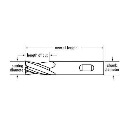 Cleveland fraise en bout, coupe centre usage général à bout simple bout carré, gamme : hg-4c, coupeur 1/2 po de diamètre, 3-1/4 po de longueur hors tout, 1-1/4 po de longueur de coupe, 4 goujures, goujure hélicoïdale, 1/2 po queue diamètre, coupe à droite, angle dhélice 30 deg, droit/weldon plat queue, hss, étamé