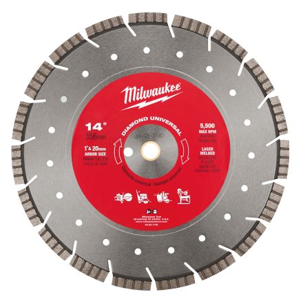 Milwaukee lame de scie diamantée, universel segmenté-turbo circulaire, 14 po lame diam., 1 po, 20 mm, 1/8 po kerf, matériaux applicables : béton vert, asphalte et fonte ductile