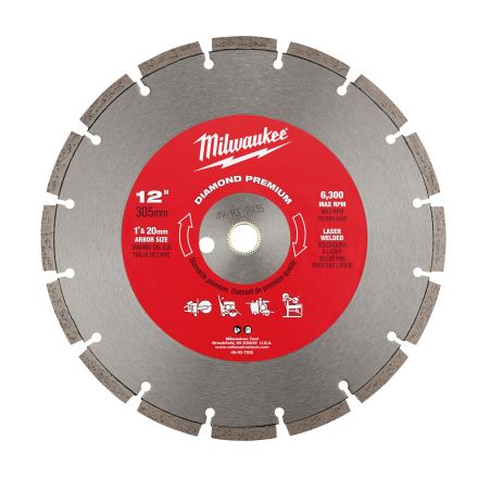 Milwaukee lame de scie diamantée, circulaire segmentée premium, 12 po lame diam., 1 po, 20 mm, 1/8 po kerf, matériaux applicables : vert béton, asphalte et fonte ductile