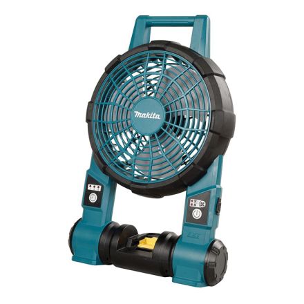 Makita ventilateur doscillation de chantier, sans fil, gamme : dcf201, outil/kit nu : outil nu, 14.4/18 V cc, 2 vitesses, 9-7/8 po de diamètre lame, lxt Batterie aux ions lithium, 5 po lx 13-3/5 po lx 21-1/10 po h dimensions, 1700 tr/min de haut, 1200 tr/min bas