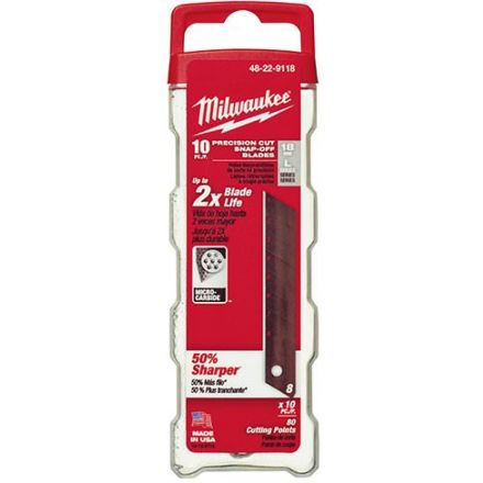 Milwaukee lame de couteau utilitaire, précision 10 pièces, gamme : pro, snap-off, 5-3/4 po lame longueur, 18 mm lame largeur, 0,02 po dépaisseur, 8 points, compatible avec : les couteaux Milwaukee les plus standards tout usage, micro carbure métal