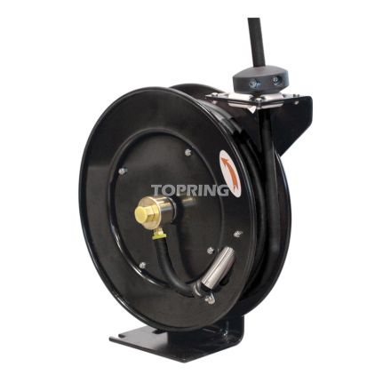 Topring enrouleur de tuyau, norme moyenne, gamme : topreel s79, tuyau 3/8 po di x 33 pi l, 250 lb/po-ca, rembobinage automatique prise, montage plafond/sol, acier, revêtement poudre époxy, noir, import